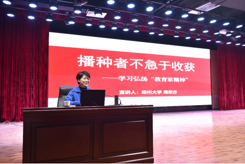 为大力弘扬教育家精神,扎实推进师德师风建设工作,10月14日下午,我校在图书馆一楼文化艺术中心举行了师德师风培训会。党的二十大代表、全国最美教师、教育部“教育家精神”全国巡讲团成员、郑州大学马克思主义学院周荣方教授应邀作主题报告,报告题目是《播种者不急于收获——学习弘扬“教育家精神”》。此次活动由副校长杨钧主持,各学院师生代表及相关职能部门人员共计400余人参加了培训。